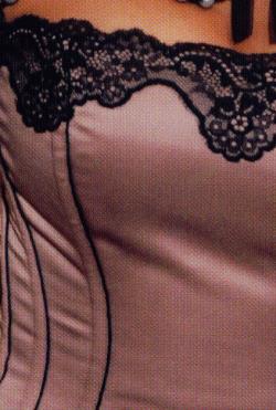 M 24 Sp-P - Romantisch-festliche Variante des Basismodells M 24, hier in altrosa Satin mit schwarzen Spitzenapplikationen am Dekolletè und vertikalen Paspeln an den Korsettnähten.