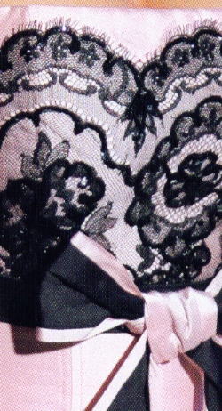 M 24 Sp-SI - Apart-festliche Variante des Basismodells M 24, hier in zart altrosa Dupionseide mit schwarzen Spitzenapplikationen im Brustbereich und grosser Schleife unter der Brust.